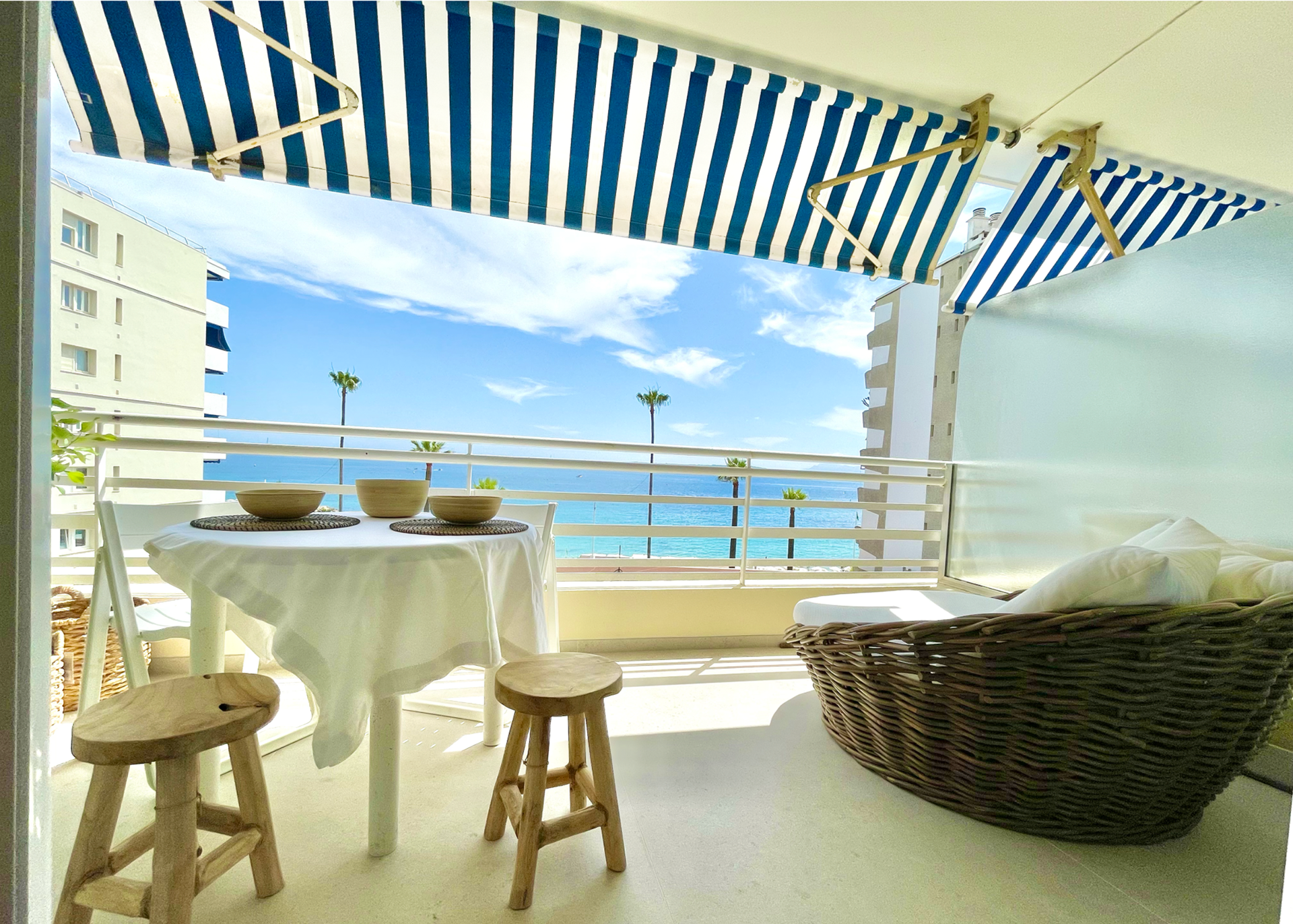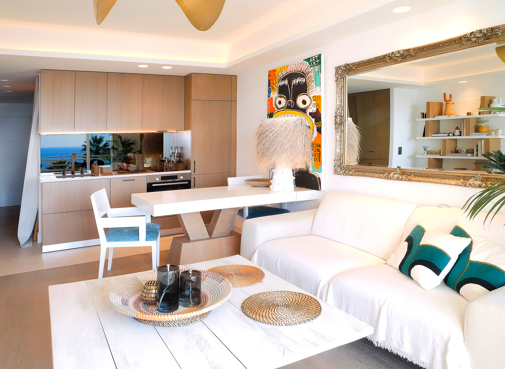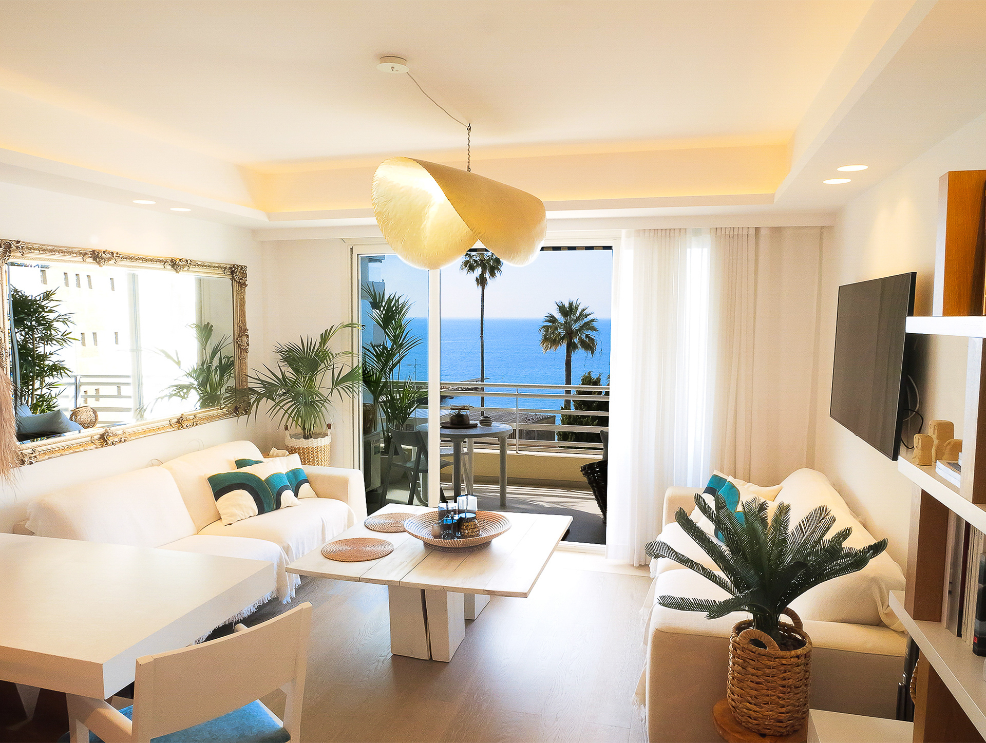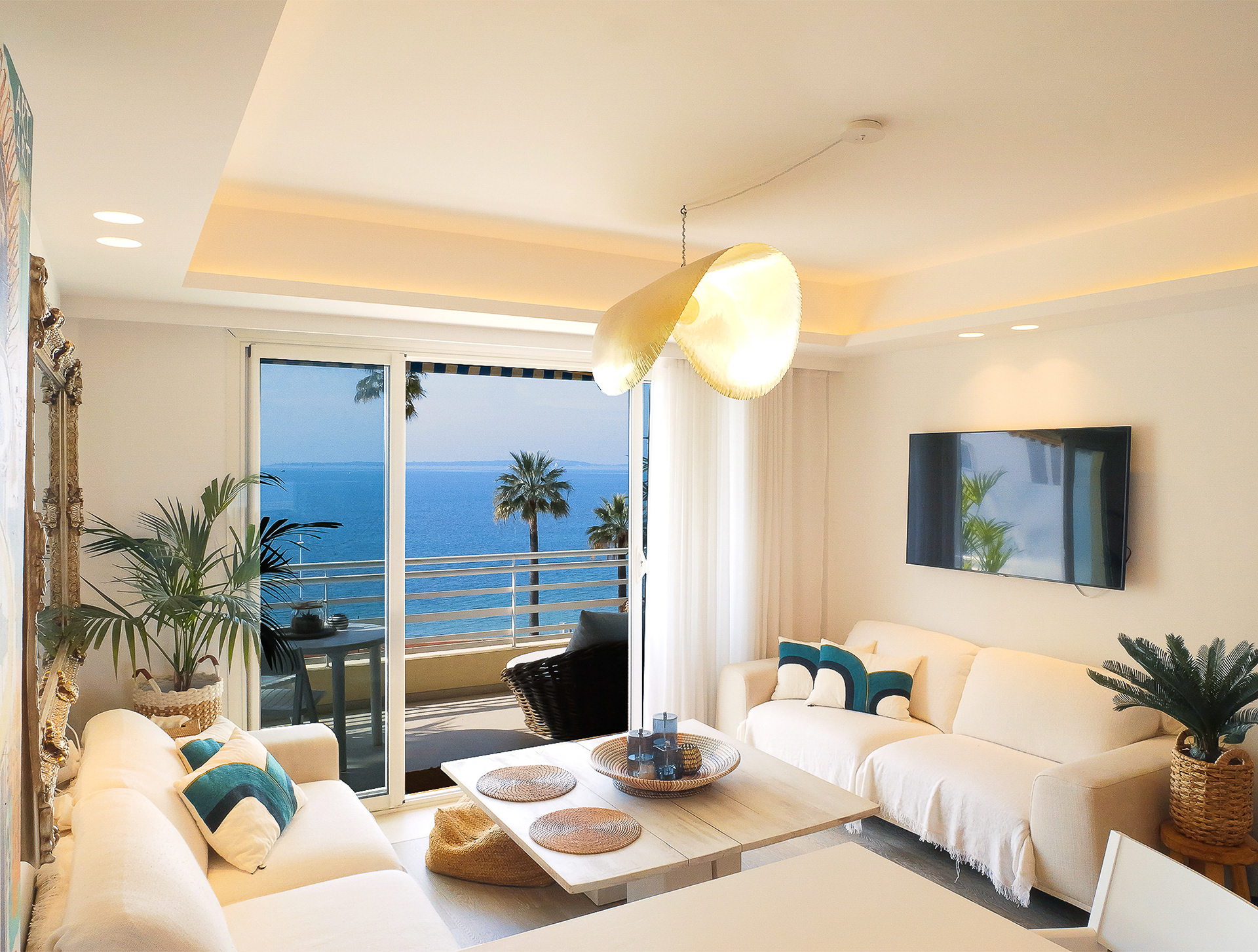 Rénovation complète d’un studio en front de mer à Antibes, situé dans une résidence emblématique face à la Méditerranée.