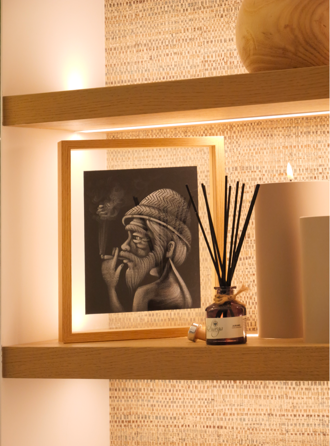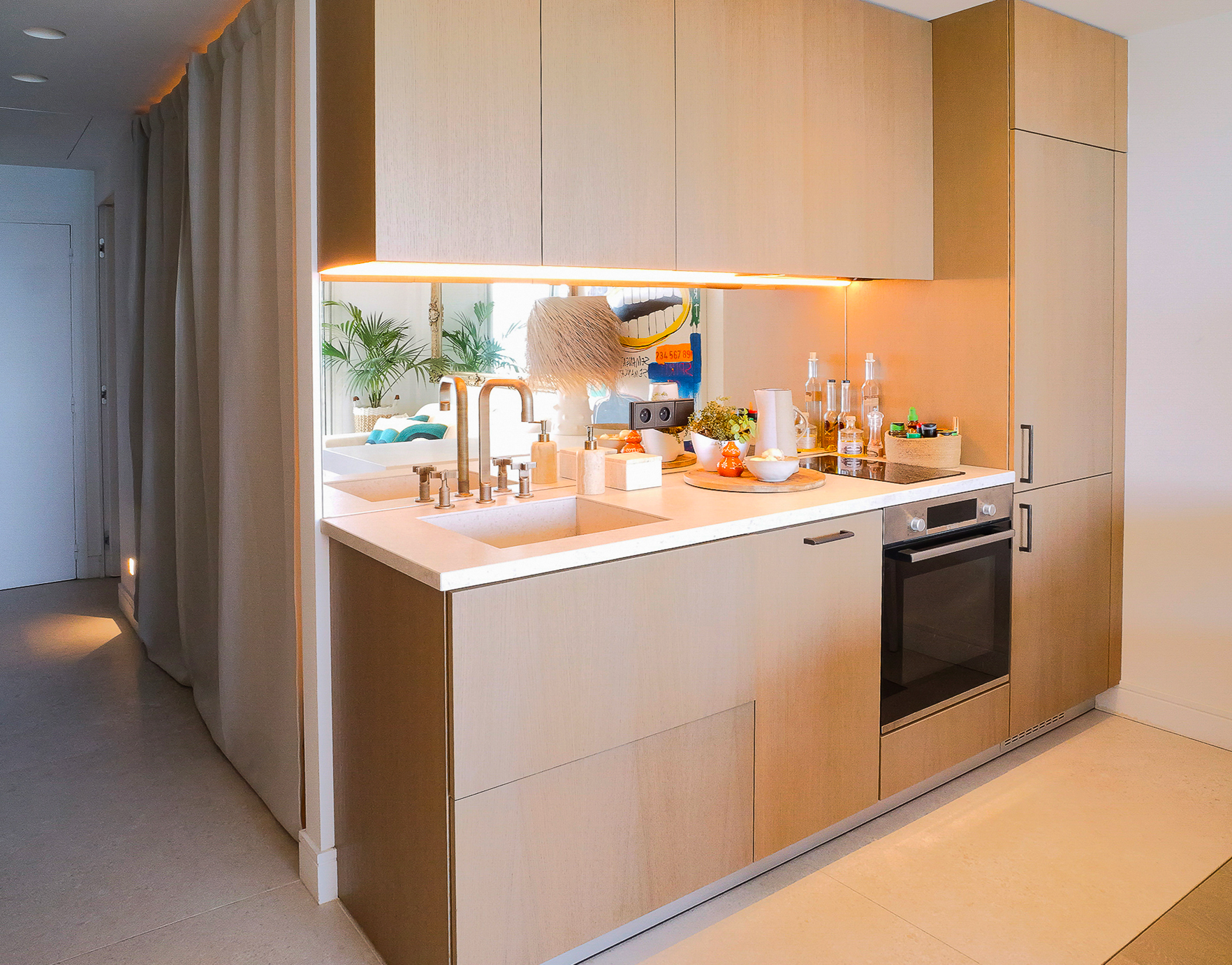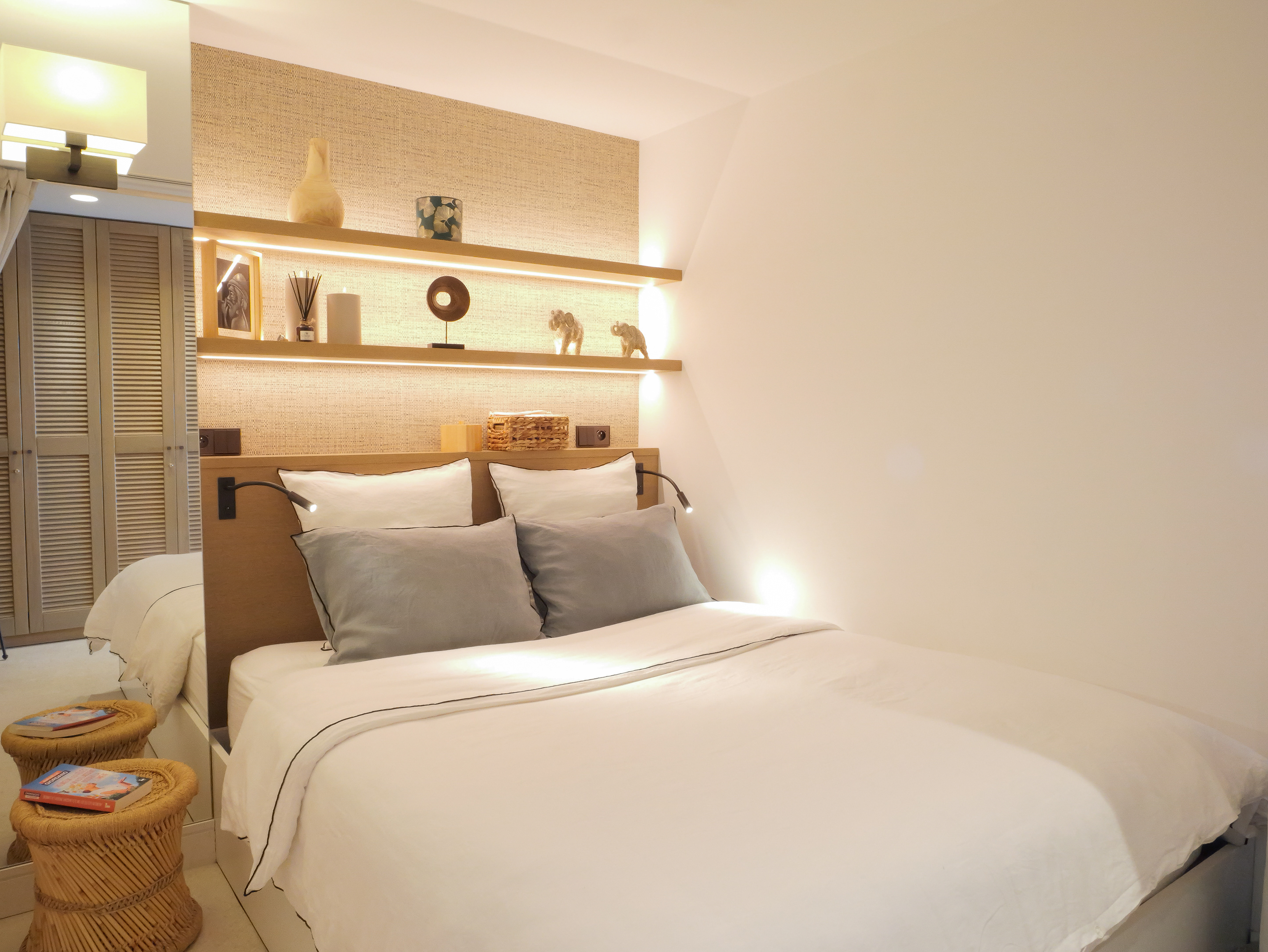 L’objectif était de réinventer un petit espace pour en faire un lieu élégant, fonctionnel et harmonieux. Grâce à une optimisation millimétrée, une circulation fluide et une sélection de finitions raffinées, le studio a été transformé en un véritable bijou, comparable à une suite de luxe avec vue mer.