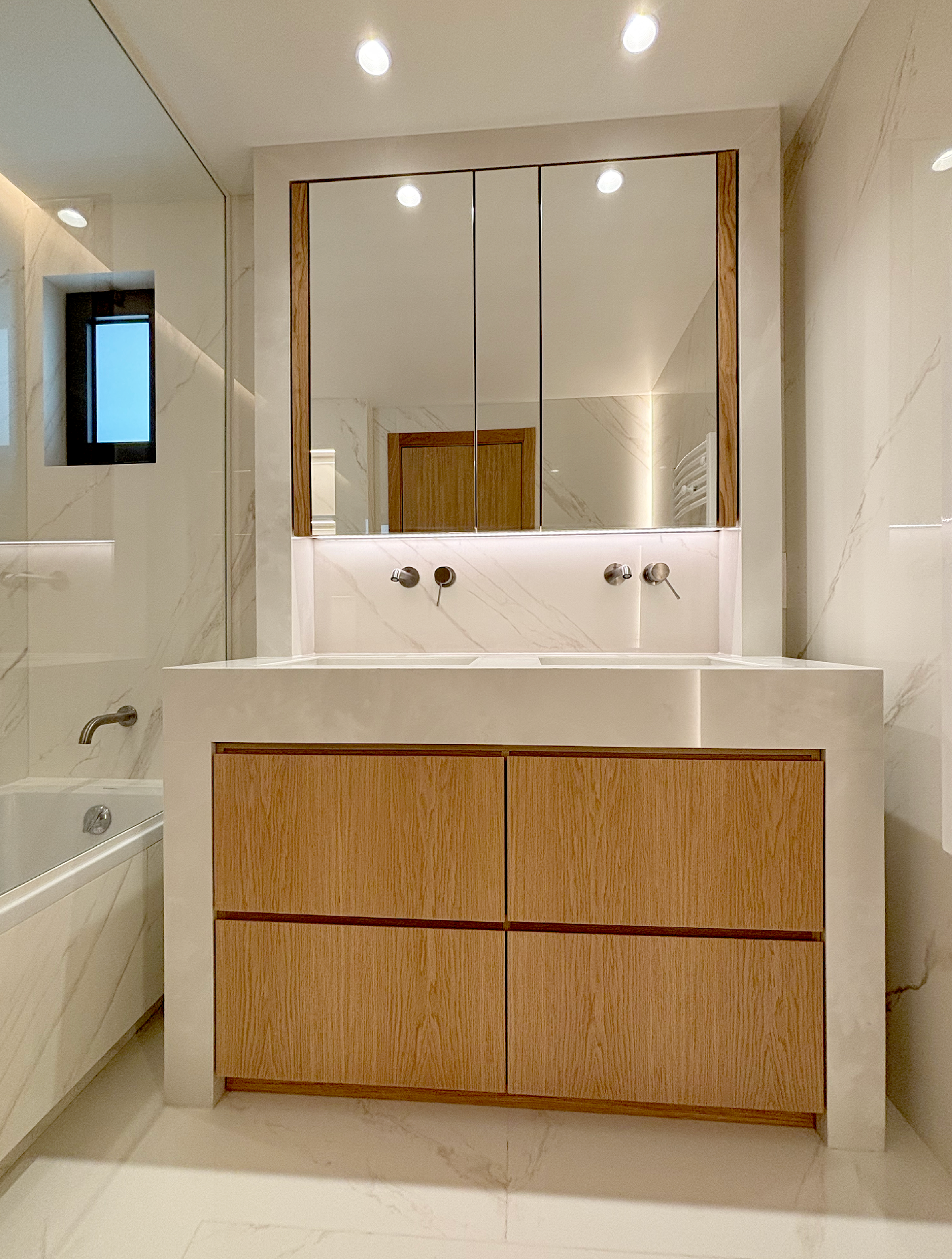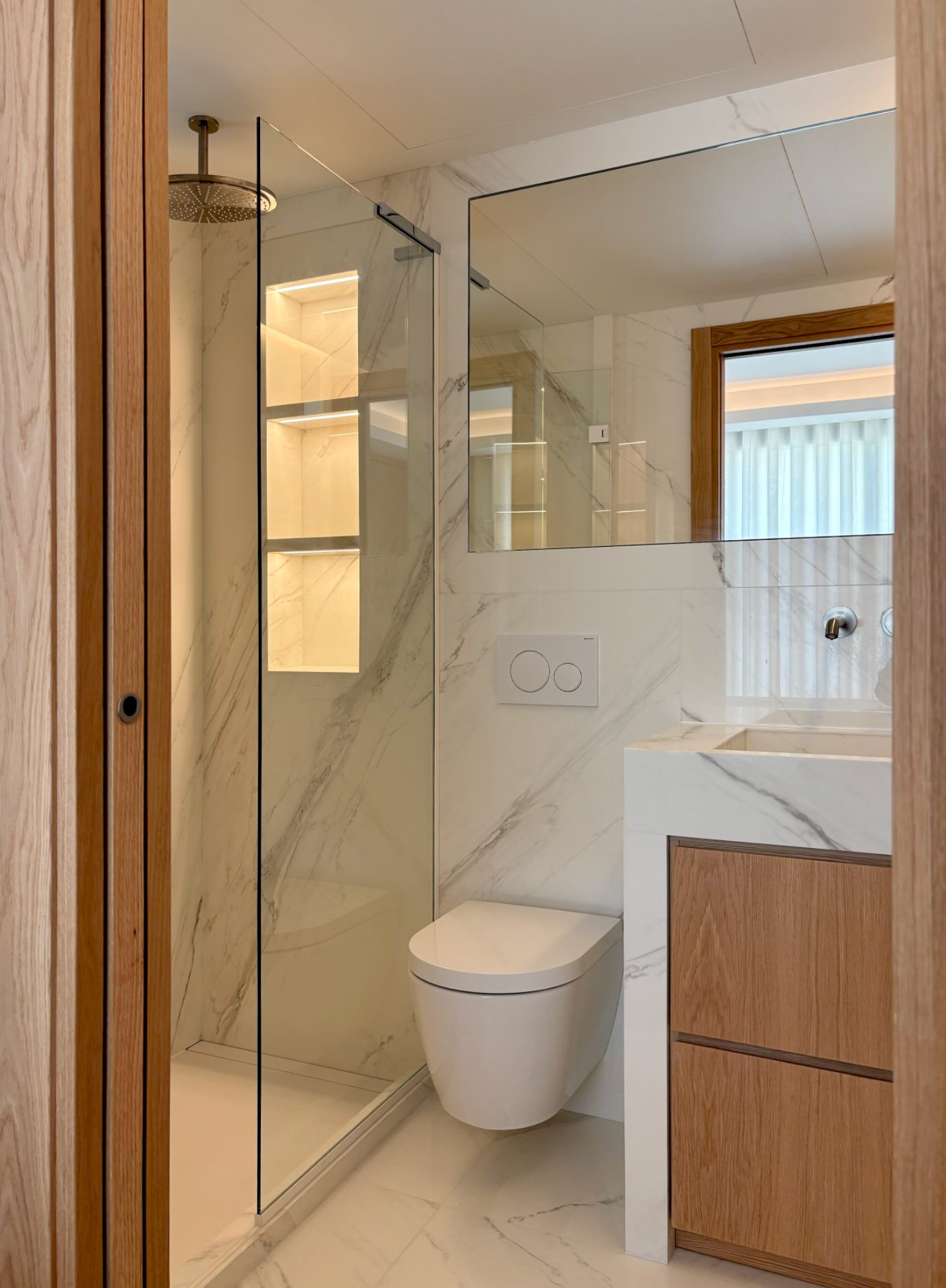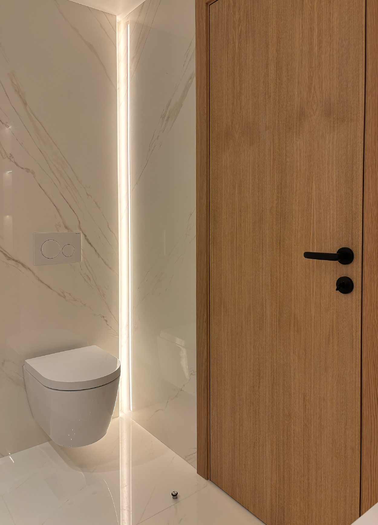 J’ai conçu les plans et les élévations en veillant à créer un espace à la fois fonctionnel et esthétique. Le choix rigoureux des matériaux a été essentiel : bois chaleureux, marbre blanc de qualité, tons naturels et apaisants pour une ambiance cosy et élégante.