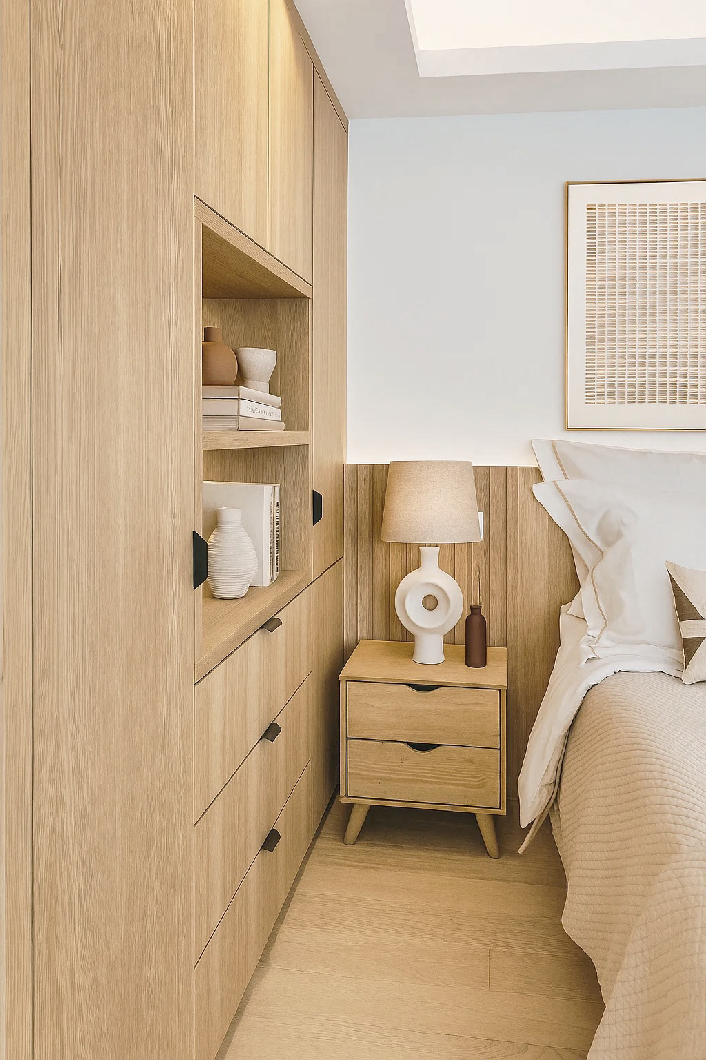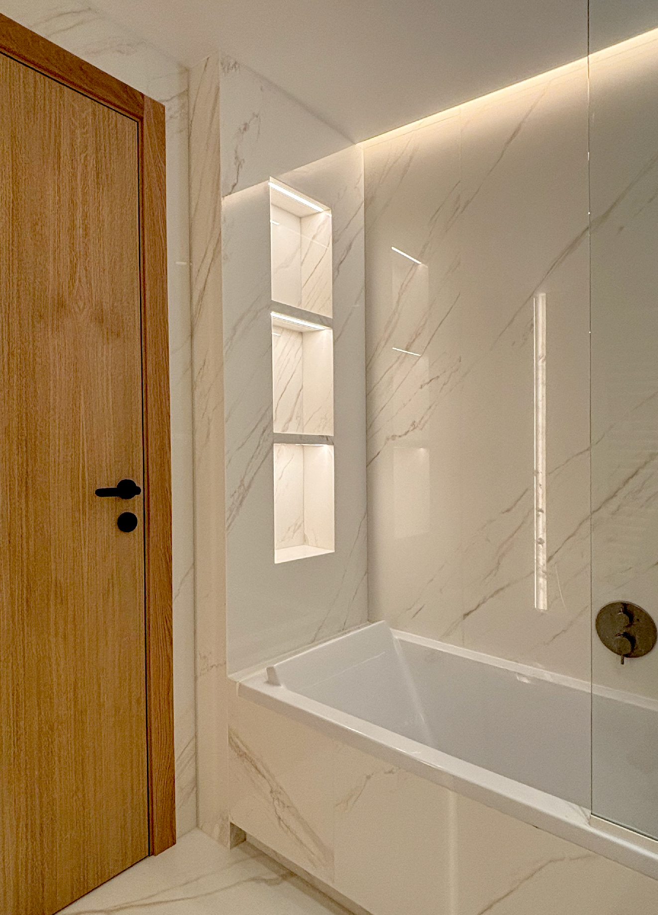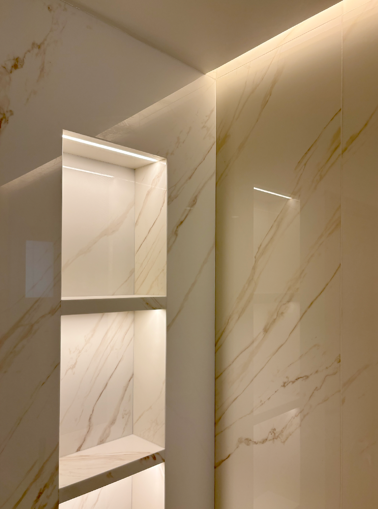 J’ai conçu les plans et les élévations en veillant à créer un espace à la fois fonctionnel et esthétique. Le choix rigoureux des matériaux a été essentiel : bois chaleureux, marbre blanc de qualité, tons naturels et apaisants pour une ambiance cosy et élégante.