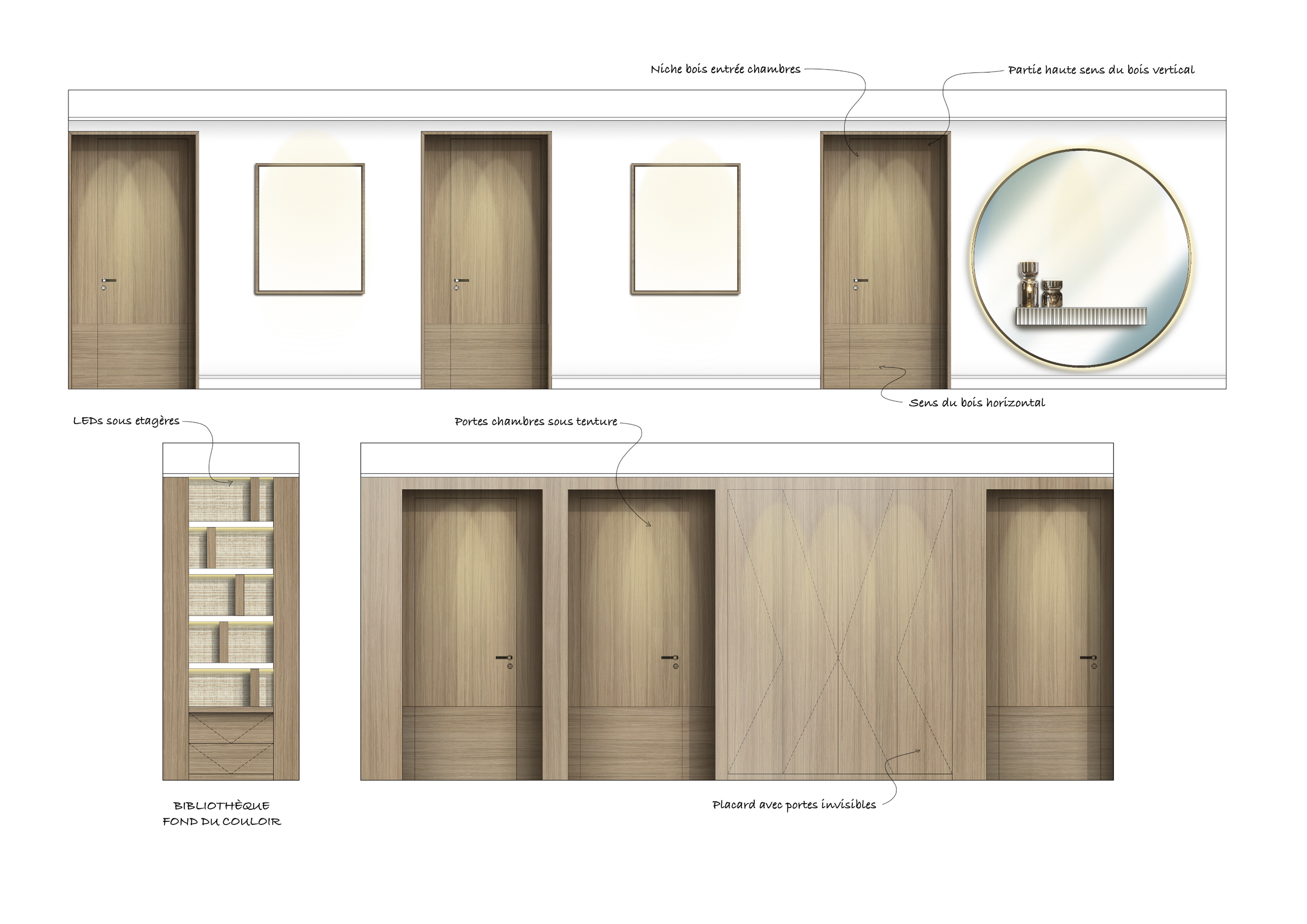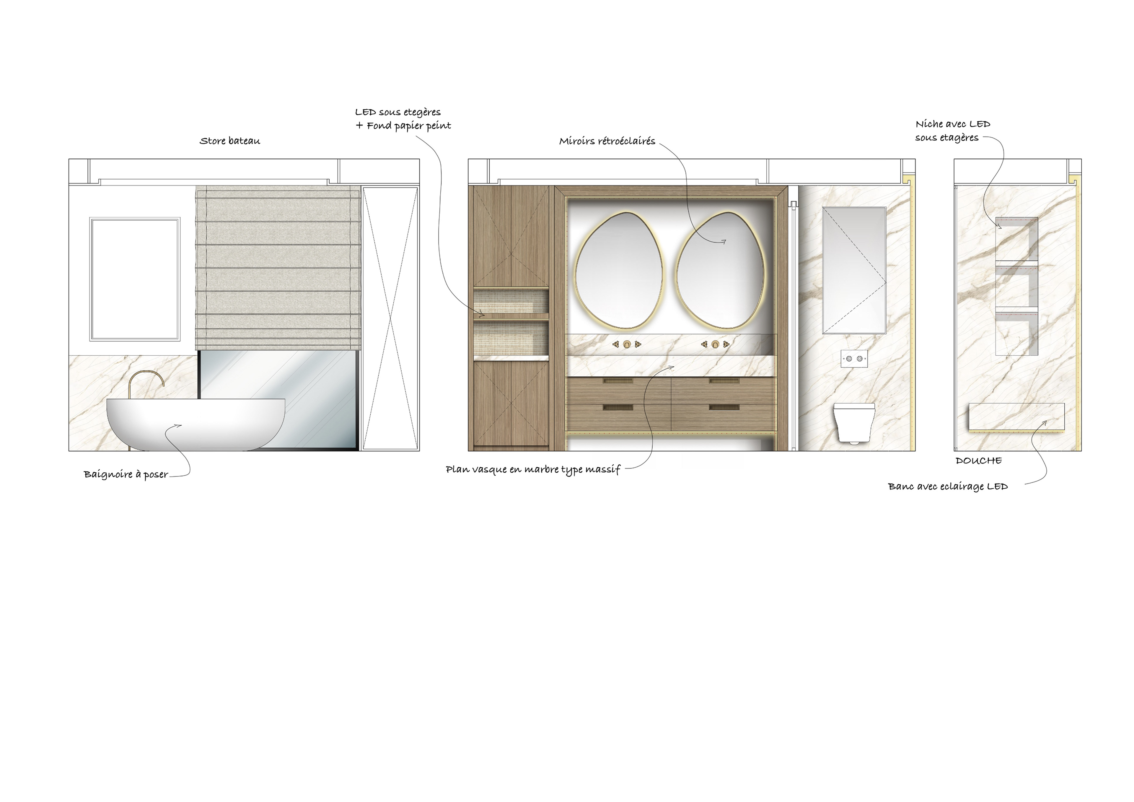 J’ai assuré la mission complète : plans techniques et plans décoratifs, choix des matériaux en accompagnement client, ainsi que la coordination des artisans tout au long du chantier.
